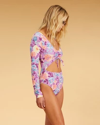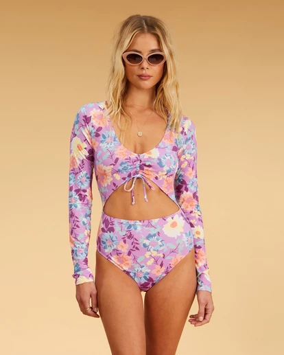 Like wildflowers blooming from the seaโ Seek the sun in the Salty Blonde Halleys Garden Long Sleeve Swimsuit. Crafted with recycled yarn, this floral one-piece stuns with a cute drawstring and cut-out at the front, plus a high-rise leg cut and skimpy bum coverage for perfect bronzing.