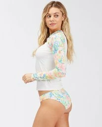 On the hunt for sun and swell, find you flow in the Sweet Tropics long sleeve rashguard. This women’s rashguard is made with recycled stretch fabric and features a solid core and island-floral printed sleeves. The perfect layer for warm water sessions, this surf top offers enhanced UV protection so your ride only stops when the sun goes down. The classic fit delivers lightweight comfort and flexibility to help you move through the water like a pro.